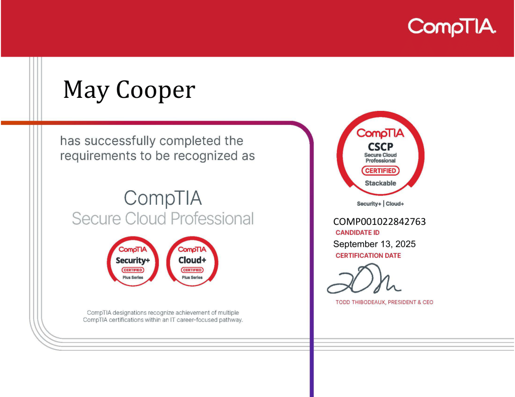 CompTIA Secure Cloud Professional – CSCP Use this ID to verify with the link below: COMP001022842763 Validation on CompTIA's site