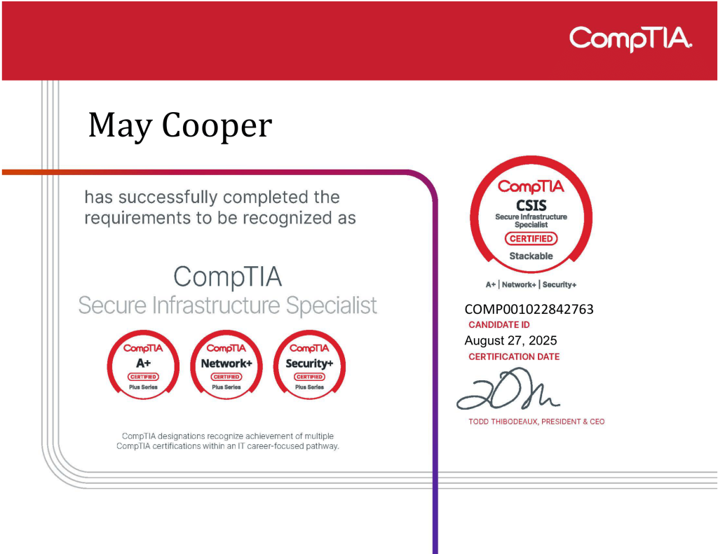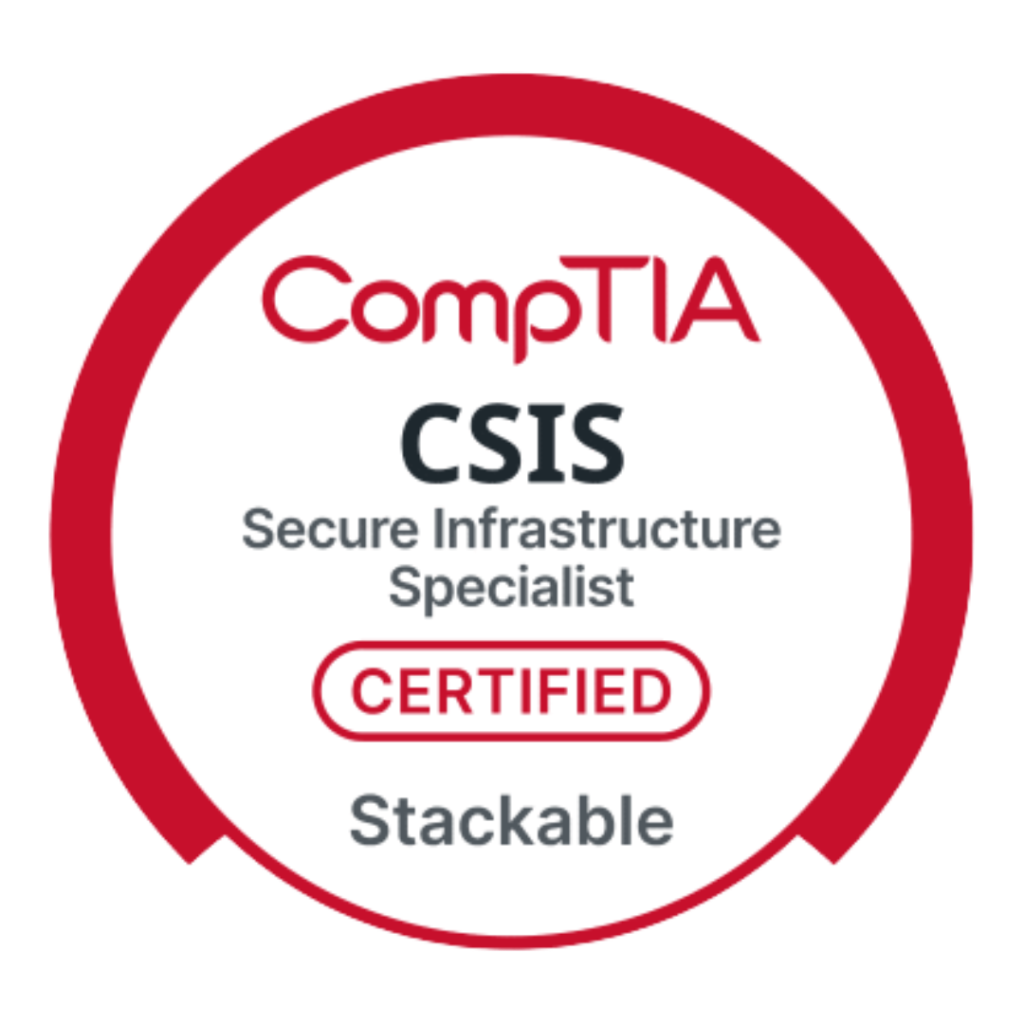 CompTIA Secure Infrastructure Specialist – CSIS Use this ID to verify with the link below: COMP001022842763 Validation on CompTIA's site